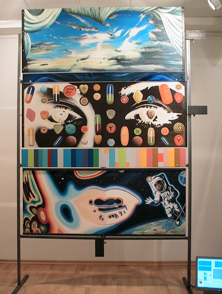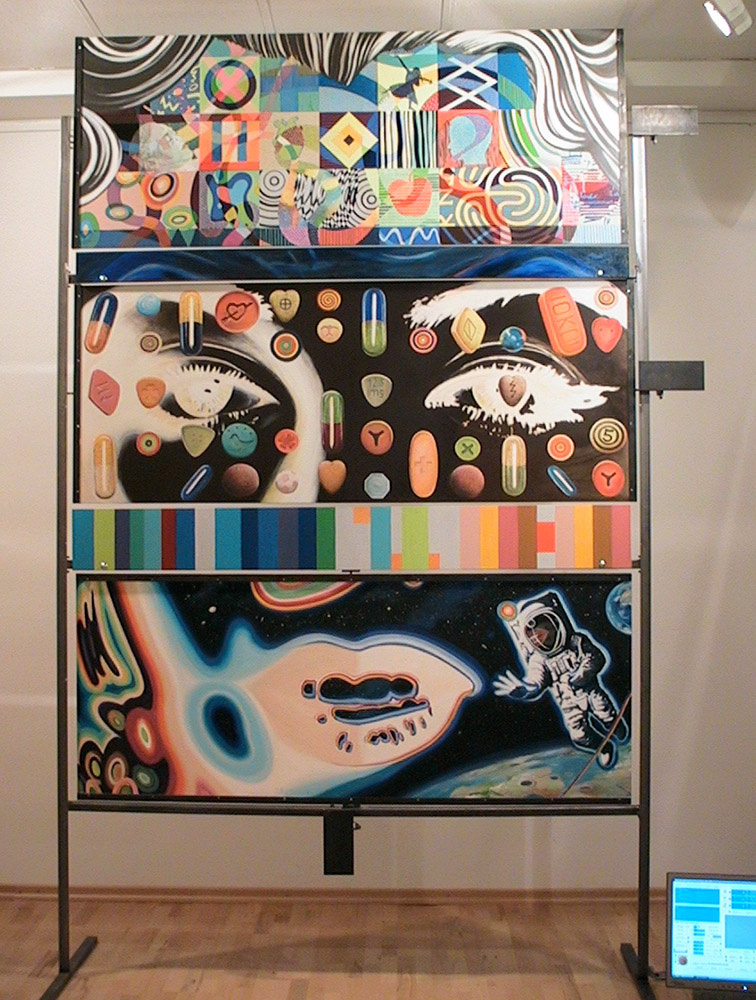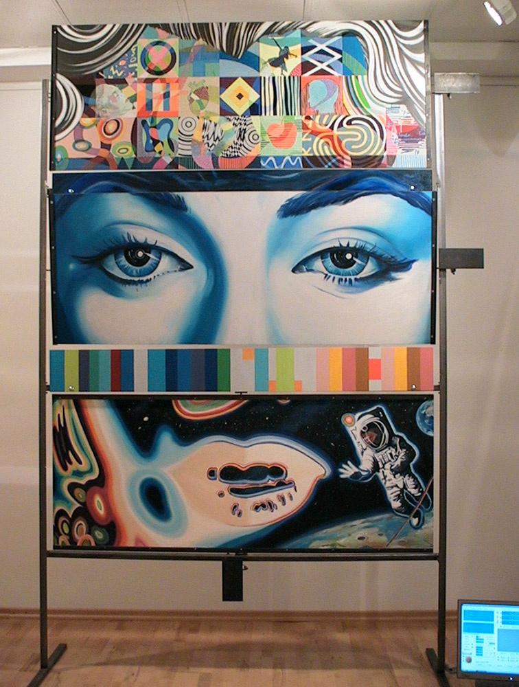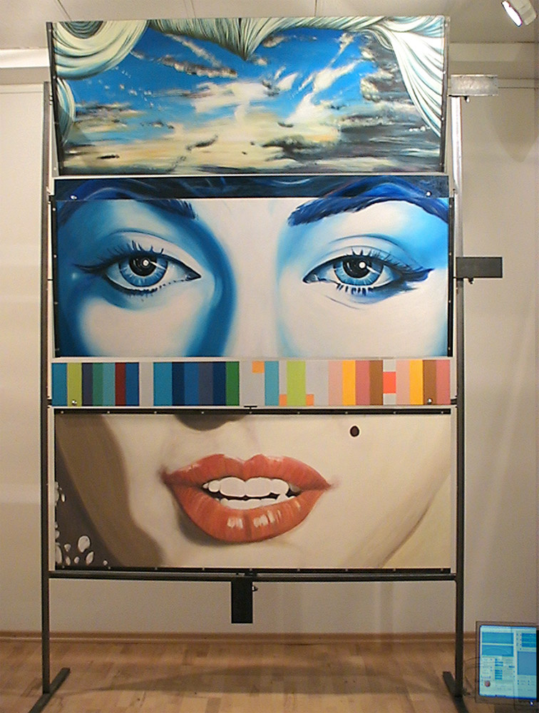 *MMM*, Morphing Marylin Monroe, 2006, 3x2m, Mischtechnik auf Faserplatten, Stahlrohr, 3 Motoren, Steuerung.